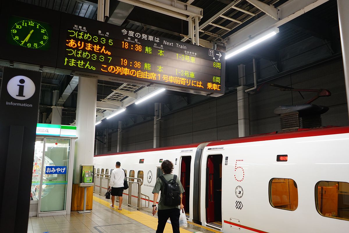 発車時刻が一番早かった博多18:36発つばめ335号、博多から熊本までの各駅に停まります。