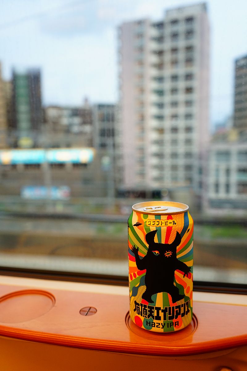 車内のお供は、博多駅のセブン・イレブンで買ったヤッホーブルーイングの有頂天エイリアンズ。 地方でもこれが買えるのはありがたいですね。 お値段349円とちょっとお高めだけど、その価値のあるビールだと思います。