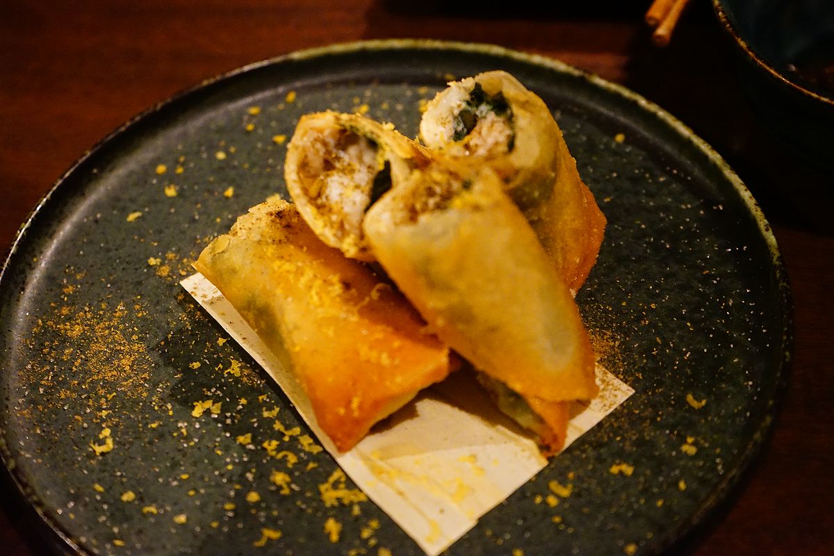 くじらじゃないメニューもございます。こちらが白子春巻き 1,480円。 白子の春巻きって珍しいっすよね、初めて食べた気がします。たっぷり白子が入っていて食べ応えのある春巻きでした。