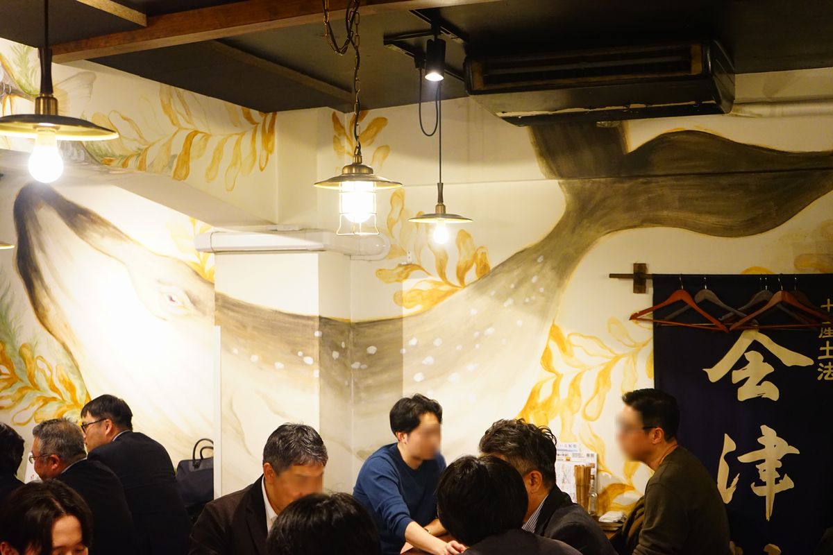 店はビルの2階にあって、カウンターが数席とテーブルが8つくらい。壁には鯨の絵がバーン!と。