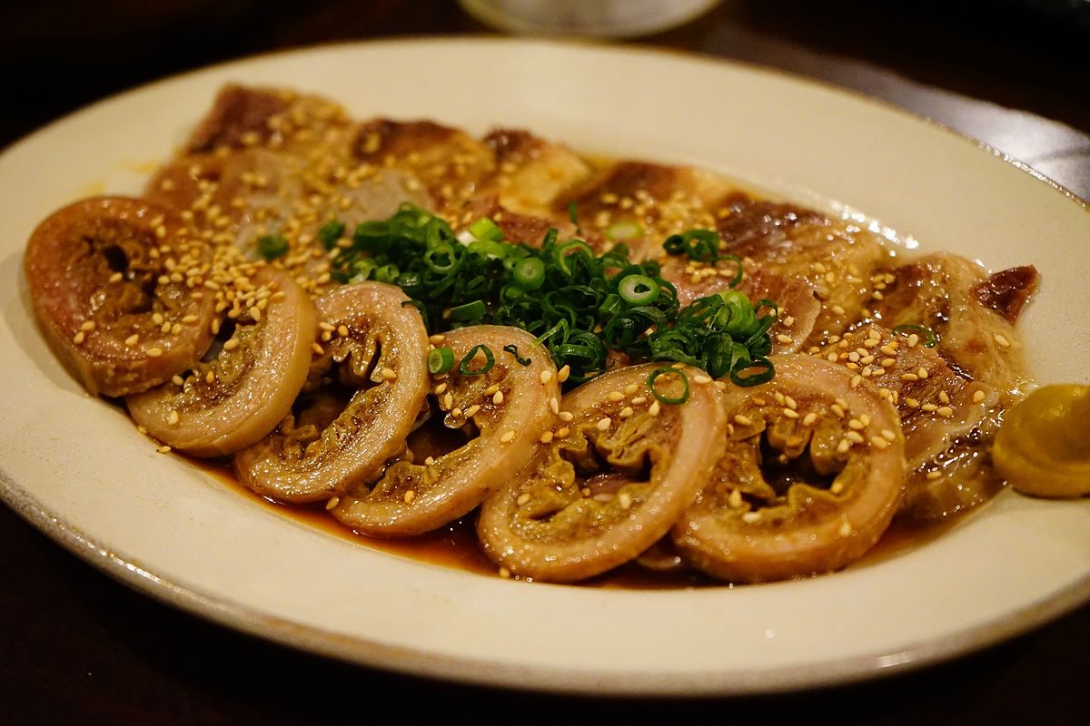 くじら三昧、どんどんいきます。もつミックス ポン酢 2,780円。奥からさえずり(舌)、百畳(胃袋)、百ひろ(小腸)だったと思います。 鯨の解体も手掛ける会社の経営するお店だけあって、鮮度が良くて臭みの無いモツでした。