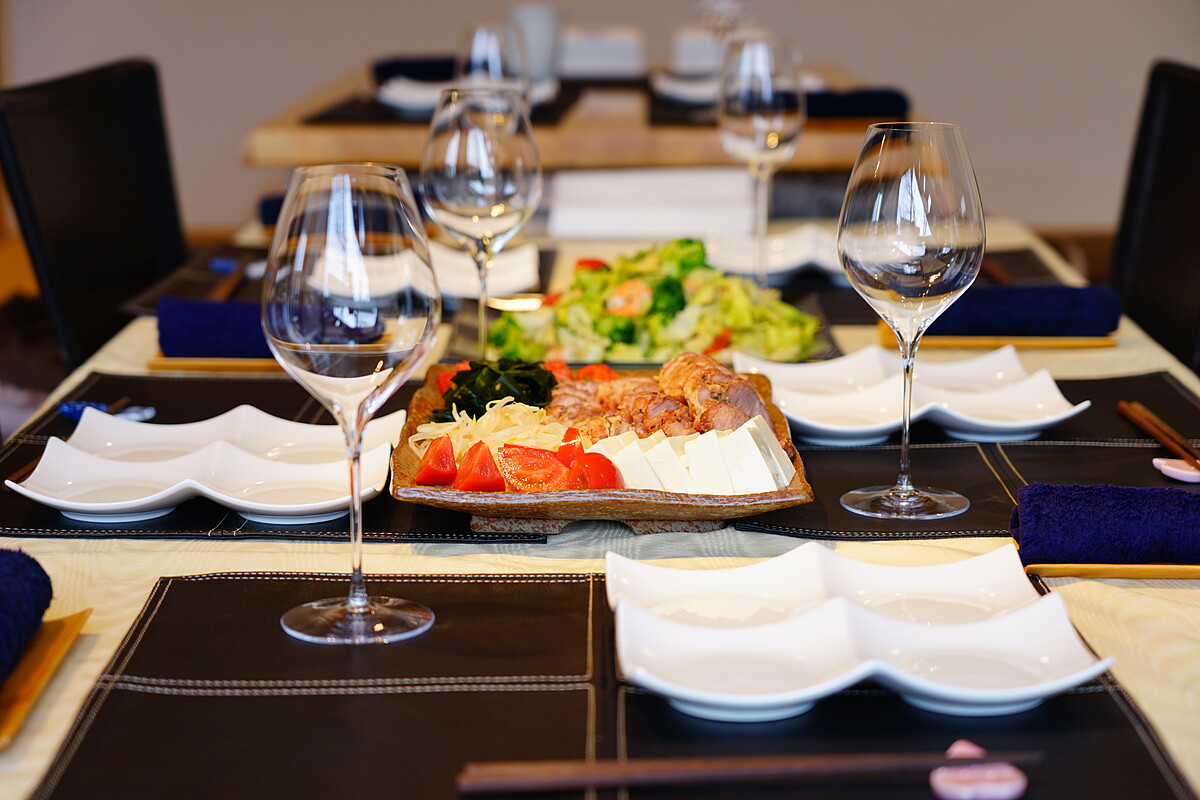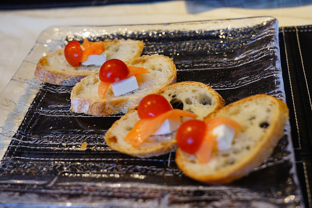 次の料理はブルスケッタ。写真はクリームチーズとスモークサーモンとミニトマトが乗せられていますが、 クリームチーズと奈良漬のバージョンも用意しました。 クリームチーズと奈良漬を合わせるのはこの時の真似っこです。