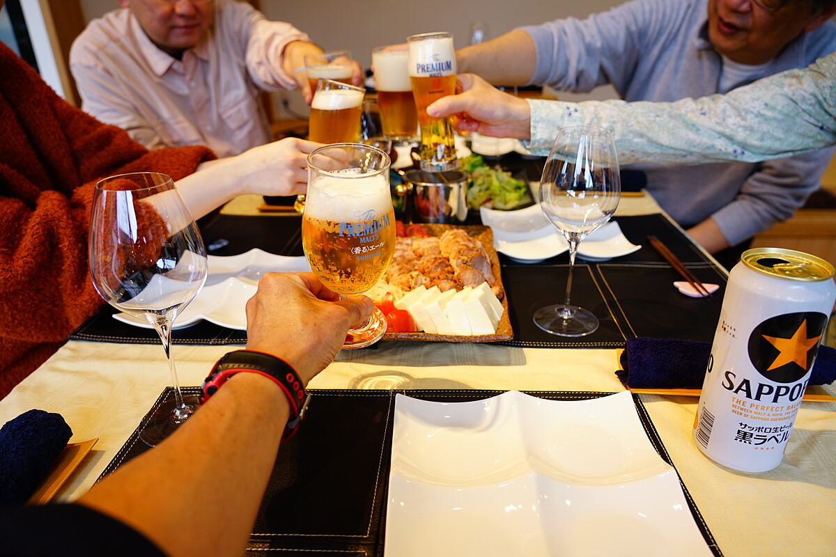 乾杯はとりあえずビールです。キーボードのMz氏が大量に買ってきてくれました。 彼はワインを飲みながらずーっとビールをチェイサーにしてました。アカンやつです。