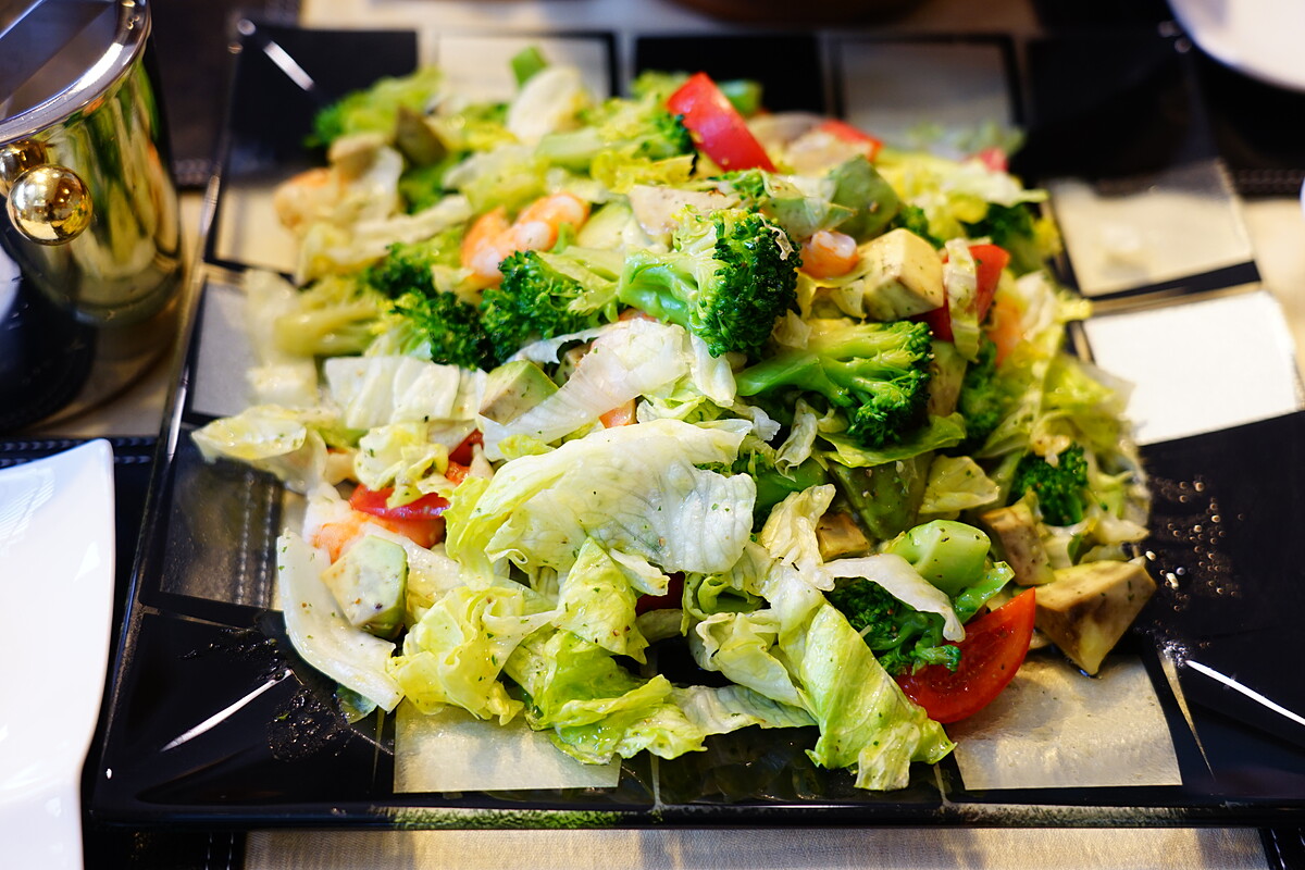 料理の1品目はシェフの気まぐれサラダ。 レタス、ブロッコリー、アボカド、フルーツトマト、エビなどが入っております。 今回は特に美味しかったな。師範代ナイス!であります。