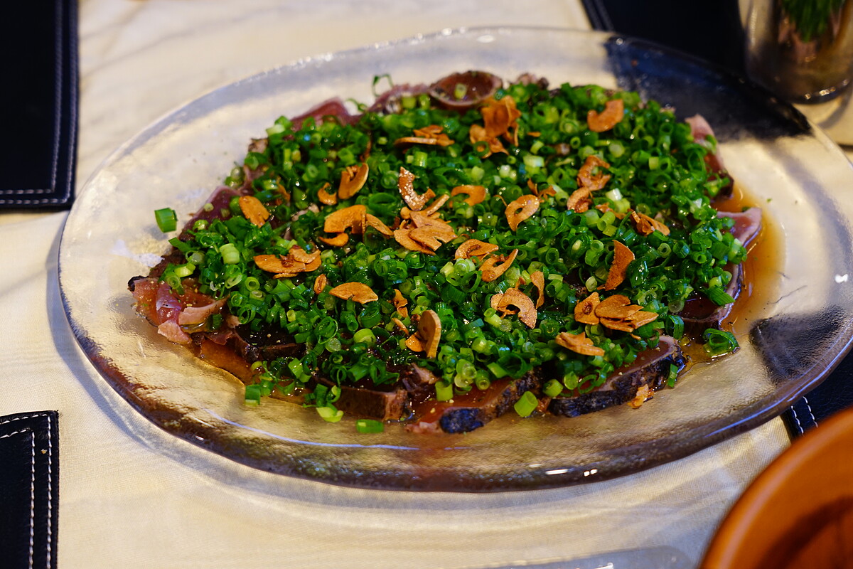 次のメニューはカツオのタタキの和風カルパッチョ、道場のスペシャリテです。 本来もっと前に出すべきでしたが、最後の調理(オリーブオイルでニンニクを炒めて上からジャーっと)を担当する師範がうっかり忘れておりました。 カツオのタタキもオーケーで買った冷凍物だったのですが、これはちょっとイマイチでした。初鰹の生を使った方が良さそうです。