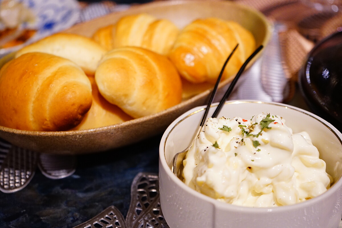 パンもそれぞれの白ワインに合わせてくれています。 手前のバターロールをシャス・スプリーンと、奥のクロワッサンをオー・ド・スミスと合わせてね、とのことだったと思います。 別皿に盛られたレモンパスタサラダを挟んで頂きました。爽やかな香りで無限に食べられます。