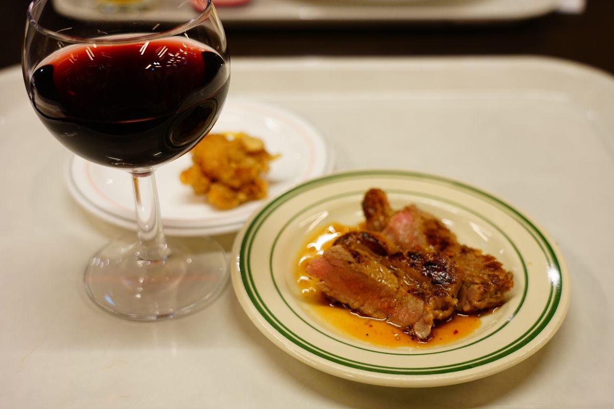 このビュッフェのスペシャルメニュー「牛ステーキ鉄板焼き」に赤ワインを合わせました。