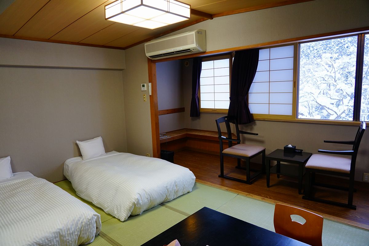 こちらが今回利用する部屋でございます。夫婦二人には十分な広さがあります。 窓の外はガッツリ雪景色、もうこれで十分です。 ちなみに、たばこは吸いませんが喫煙可能な部屋でした。その方がずっと安かったとのこと。そういう時代なんですね。