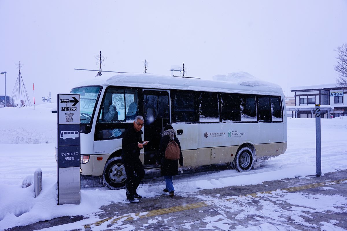 ・・・というわけでもちろん歩くのは無理なことが事前に想像されたので、宿の送迎バスを利用します。 マイクロバスに揺られること10分、 こんな中でも車は普通に走るのね。雪国をほとんど知らない身としては驚くことばかりです。