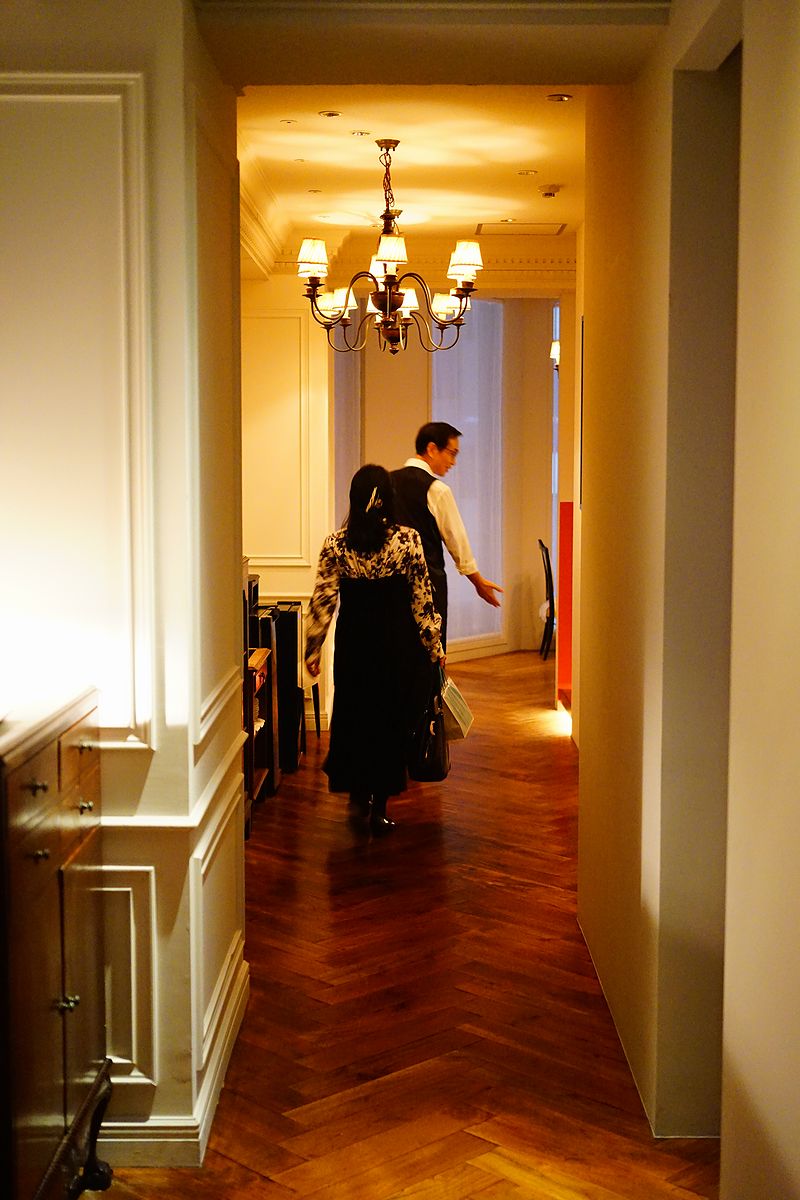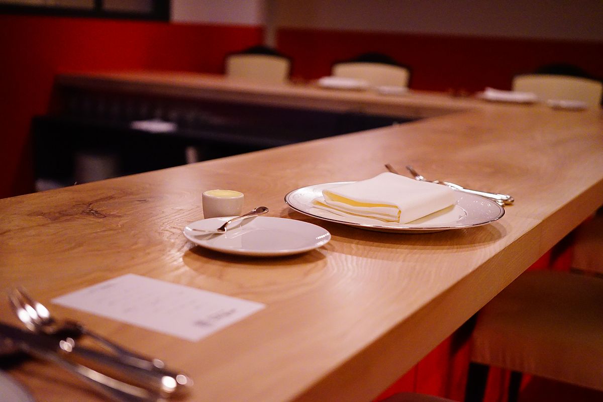 寿司屋のような段差のないカウンターとオープンキッチンで、シェフが調理される姿を目の前で眺めることができます。